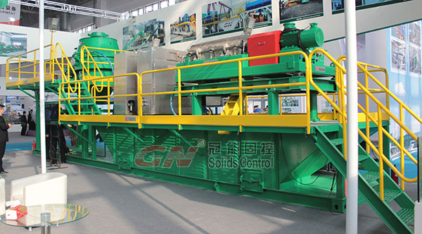 本屆石油展我們推出了一款鉆屑處理系統(tǒng)。該系統(tǒng)包括一個立式巖屑甩干機(jī),一個高速離心機(jī),雙螺桿泵和兩個正壓控制系統(tǒng)。該系統(tǒng)是綜合我們大量客戶的實際要求而設(shè)計的標(biāo)準(zhǔn)化鉆屑處理系統(tǒng),可以為客戶處理不同工況下的水基泥漿和油基泥漿。