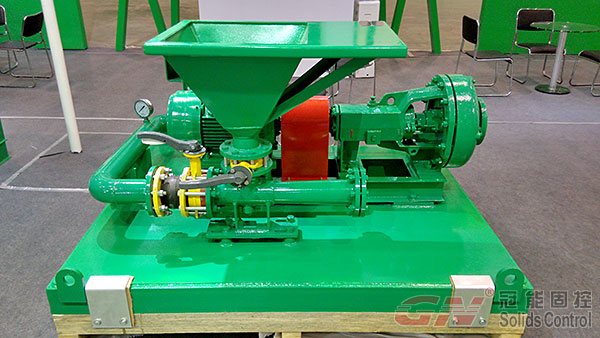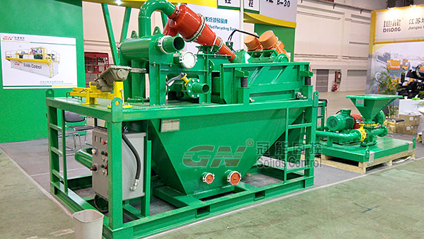 本次展會主要展出了120m³/h處理量的泥漿回收系統(tǒng)及配套的射流混漿系統(tǒng),主要配置了一臺GNZY753E-Y1S型篩泥一體機(jī),雙層篩網(wǎng)設(shè)計,面積達(dá)到2.225m³,可分離固相粒度40微米,旋流器采用高質(zhì)量聚氨酯材質(zhì),耐磨,使用壽命長,振動電機(jī)采用國際意大利OLI品牌或者美國馬丁品牌,篩箱底框采用不銹鋼材質(zhì),振動強(qiáng)度達(dá)到7.1G(可調(diào)),并配有GNSB6×5A(37KW)離心泵為除泥供漿泵,采用機(jī)械密封,使用壽命長并便于維修。整套系統(tǒng)撬裝設(shè)計,移動便捷,使用方便。