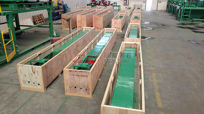 2、配備12臺螺旋輸送器,用于振動篩,泥漿清潔器、離心機等固控設備處理后排出的鉆屑,并提供給鉆屑甩干機。冠能公司生產(chǎn)的螺旋推料器U型槽增加了框架支撐,電機和齒輪箱也有鋼框架的保護。螺旋材料采用16Mn,具有更好的耐磨性,螺旋設計12英尺為一節(jié),方便現(xiàn)場安裝及運輸。