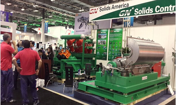 本次我公司參展的是一臺處理量達(dá)240立方米/小時(1056GPM )的泥漿清潔器和一臺GNLW553 - VFD是鉆井液離心機。GNLW553 – VFD離心機是一臺大體積大處理量的離心機,具有專門的變頻器和PLC控制系統(tǒng)進(jìn)行快速處理操作。